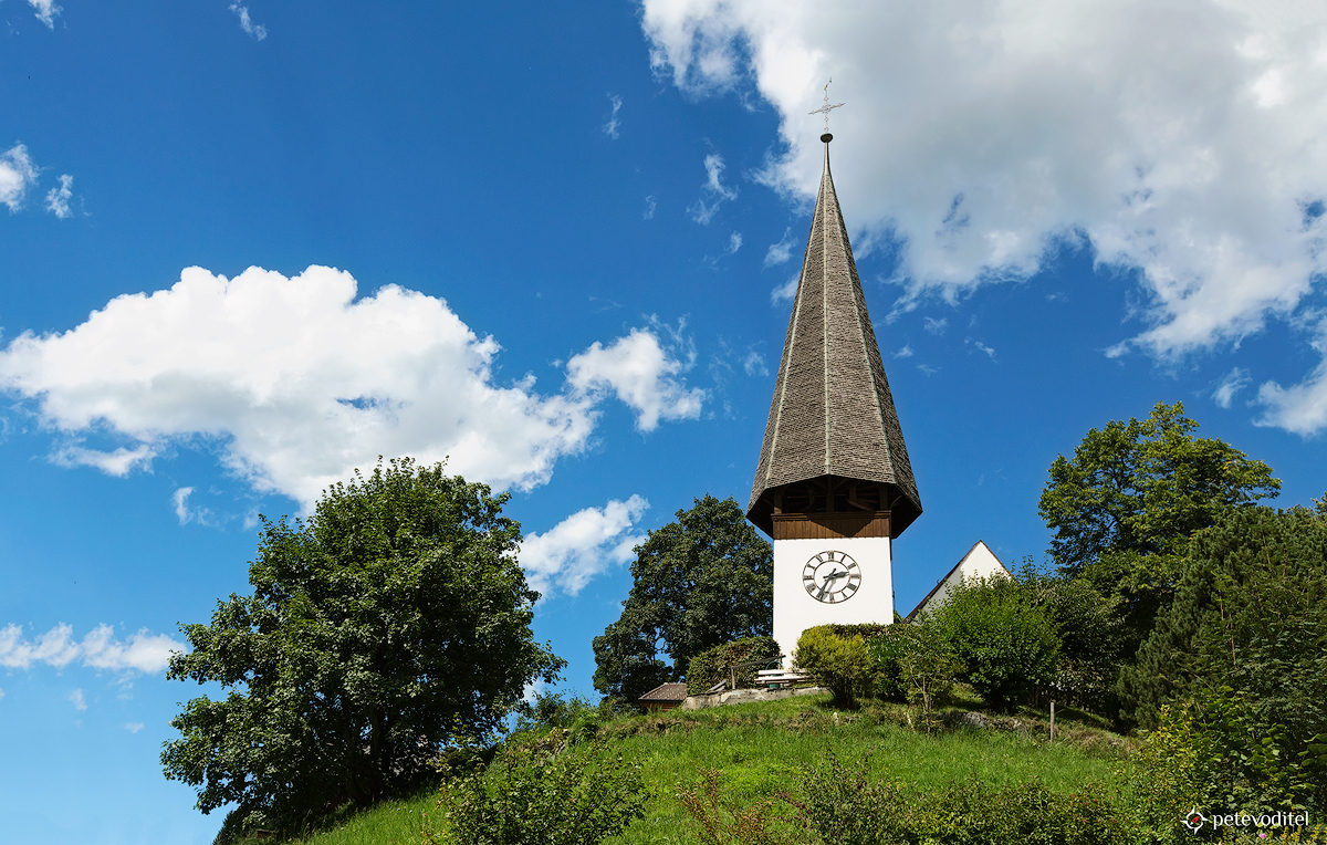 Църквата във Венген. Курортът се намира в подножието на Юнгфрау. От 1893 г. насам може да се стигне до Венген пеша или с железопътната линия Wengernalp, колите остават паркирани в Лаутербрунен.